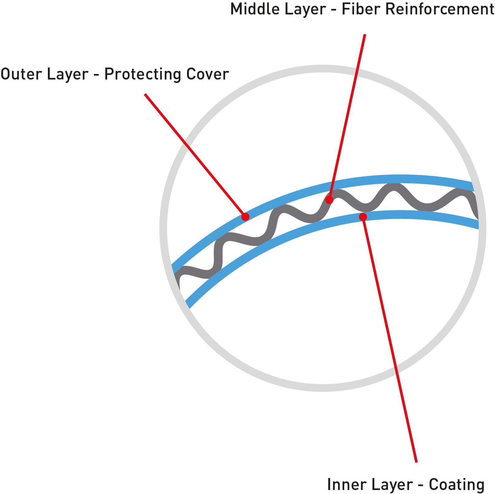The IH LINER is fiber reinforced. With its three-layered composition, the liner combines flexibility with extremely high material strength. Outer Layer – Protecting Cover: Polyethylene, thermoplastic polyurethane or other elastomers to protect the fiber reinforcement from damage and to ensure that the liner remains axially and radially dimensionally stable.Middle Layer – Fiber Reinforcement: Seamless circular-wover layer that provides high resistance to internal pressure.Inner Layer – Coating: Polyethylene, thermoplastic polyurethane or other elastomers with high chemical and temperature resistance and excellent mechanical properties.